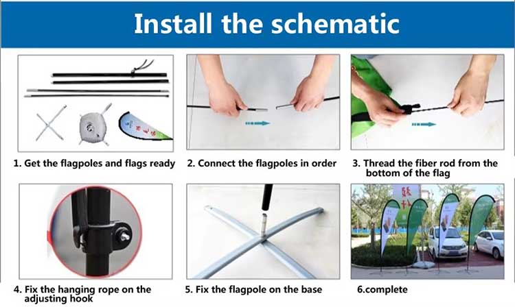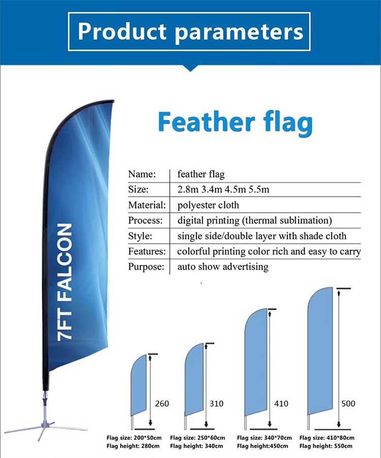• Size: Customize feather flags are size of 1.6×6.5 FT/49×200 cm, 2×8 FT/60×250 cm, 2.6×11 FT/80×340 cm, 3×13.5 FT/95×410 cm